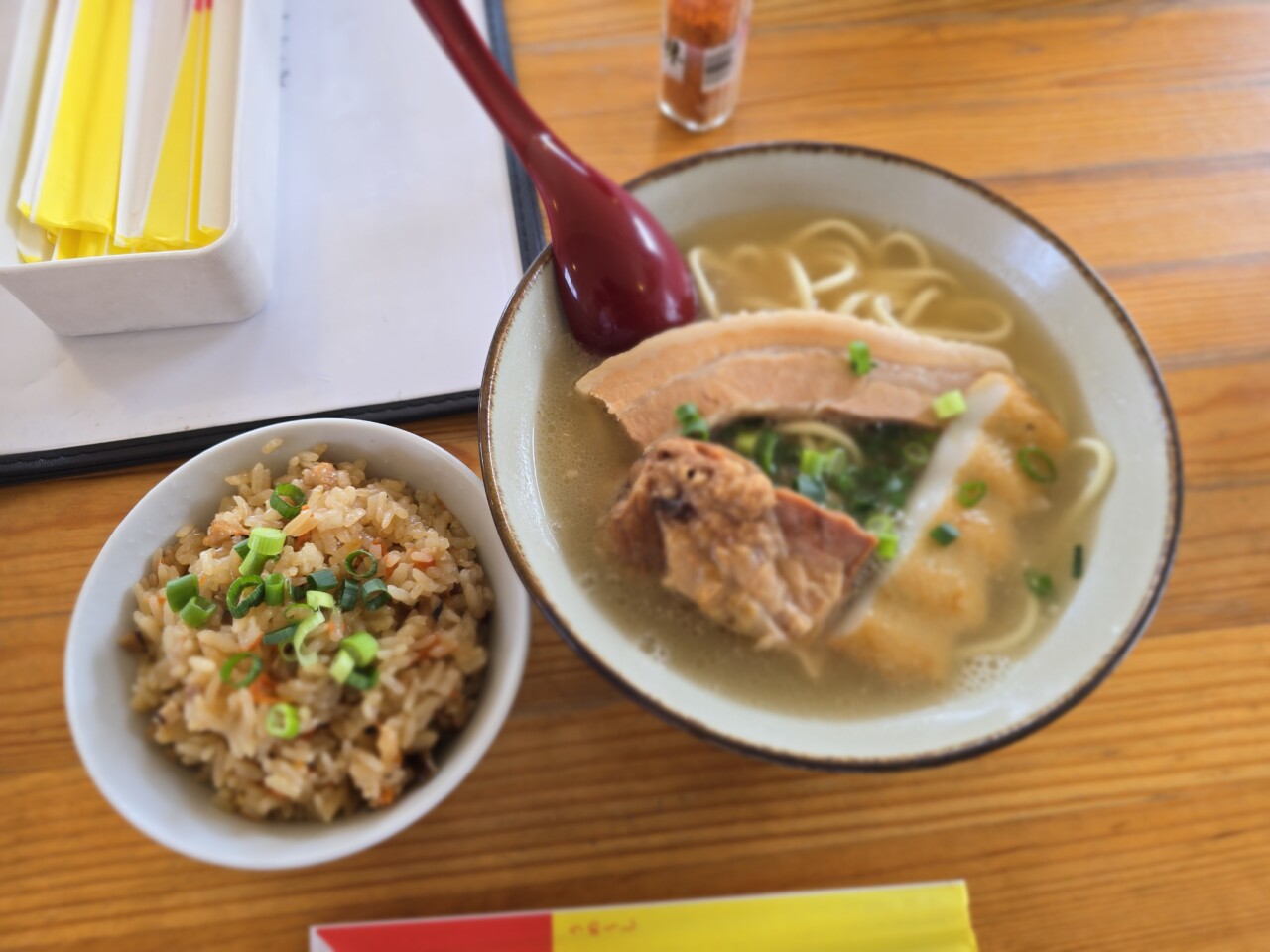 着いたらすぐにここ。宮古そば「まっすぐ」さんです。もうお昼ですから、腹ペコです。ジューシー(こっちの炊き込みご飯みたいなの)と、中盛りの肉盛り盛りな宮古そば。これを食べないと始まりませんから。