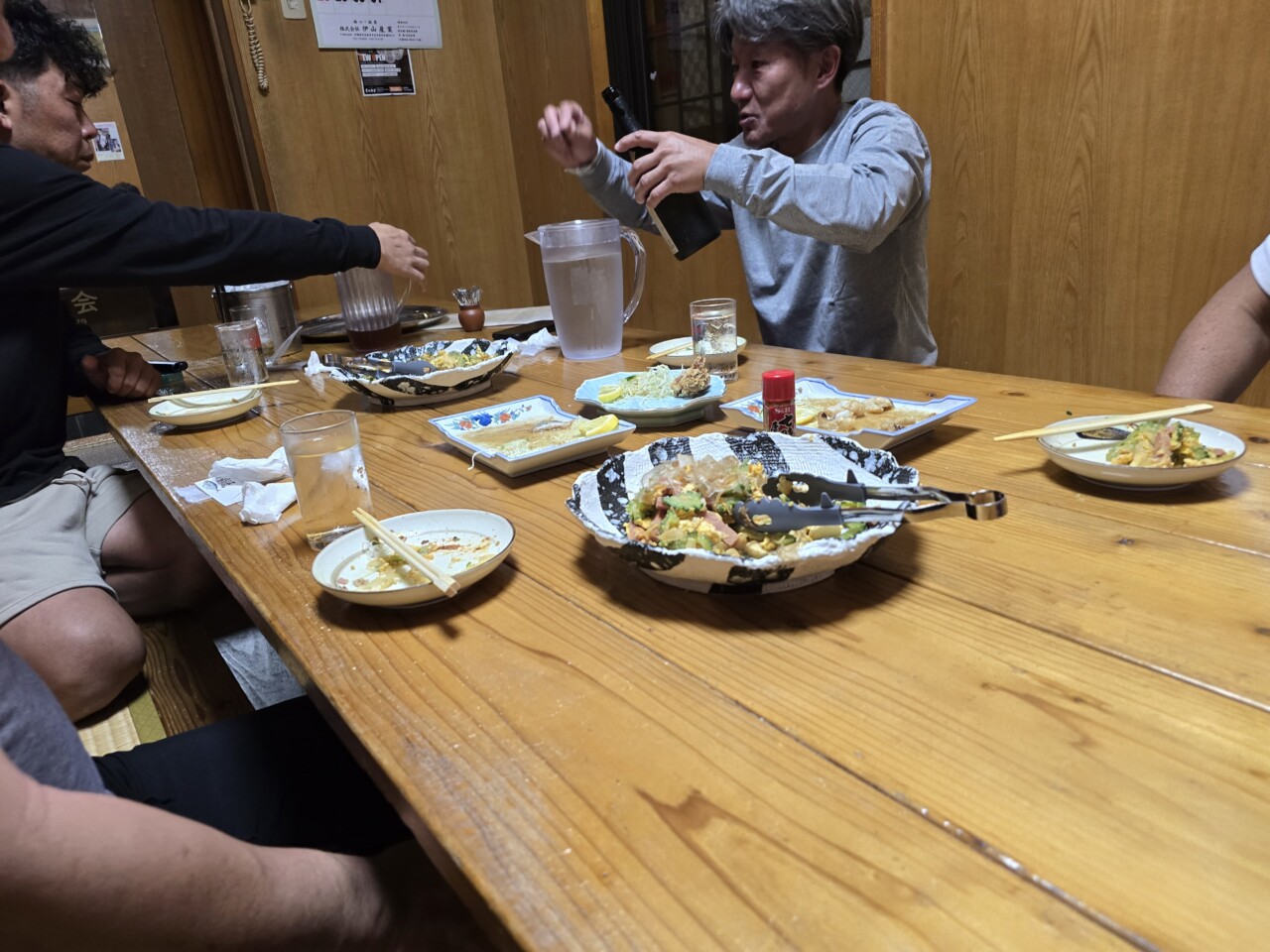 夜ご飯も美味しくいただきまして、いい感じにお酒もすすんで楽しい初日が終了いたしました。